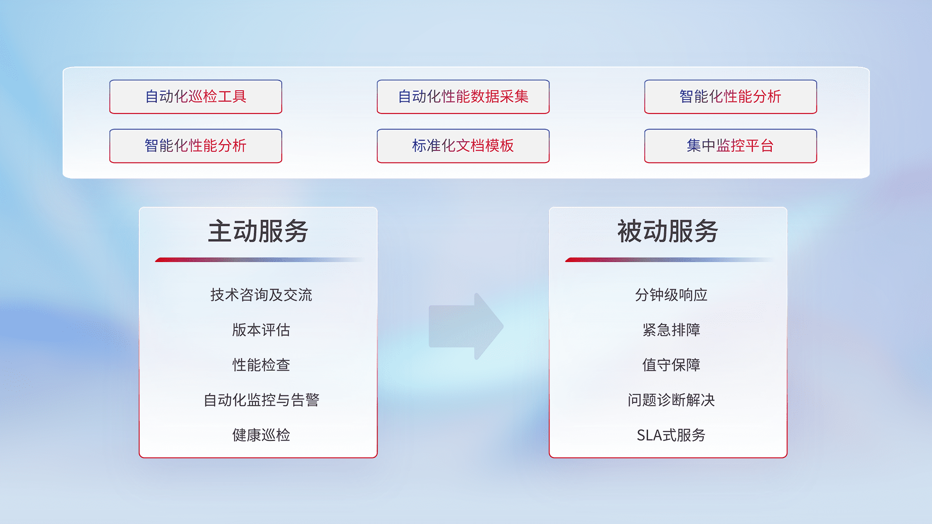 智能化工具和标准化文档,,保障服务质量,,提供主动服务(包含技术咨询、、、版本评估、、、、性能检查、、、自动化监控与告警、、、、健康巡检)和被动服务包含(分钟级响应、、、、紧急排障、、、、值守保障、、、、问题诊断解决、、、SLA服务)。。。